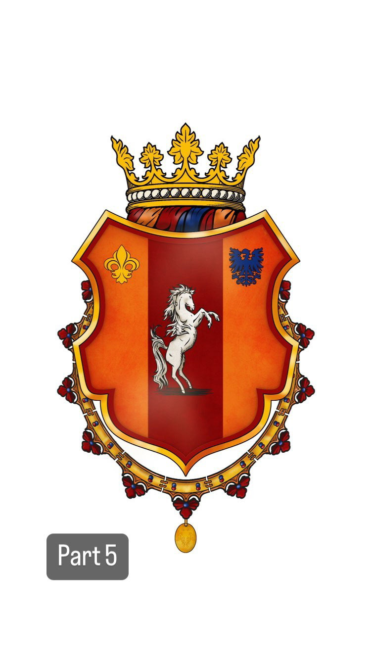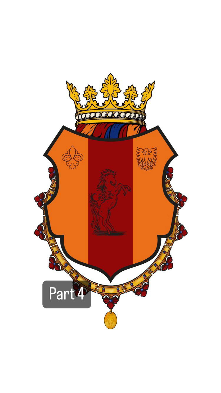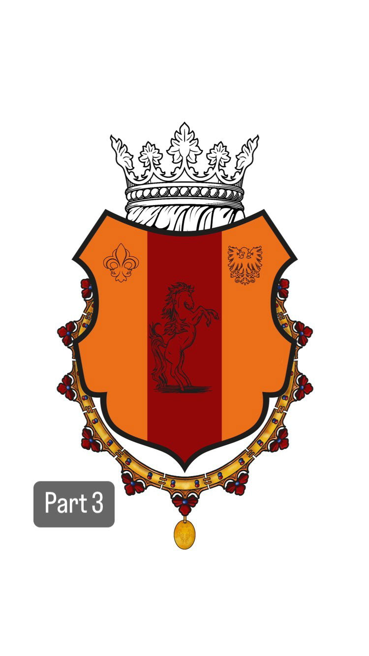 Farben: Rot und Orange, vielleicht etwas Blau und Gelb. Und vielleicht eine Krone oben auf. Etwas Historisches sollte noch untergebracht werden. Ein Teil der Familie kommt aus Viehdorf, der andere aus Ostpreußen. Vielleicht eine Lilie und ein Adler, aber ruhig etwas moderner.